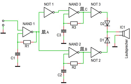 Alarmsirene oder für andere geräuschgebundene Zwecke nutzt, ist natürlich völlig irrelevant. Interessant dabei sind die zwei Logikbausteine, die dazu verwendet werden,
