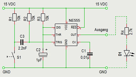 des Ausgangsimpulses kann mit der Kombination R3/C2 eingestellt werden. Die Formel lautet: