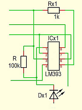 am Widerstand Rx1 höher, als die des ersten Komparators (Pin 3). Sobald die untersuchte Spannung (Anschluss Pin 2 und 6)