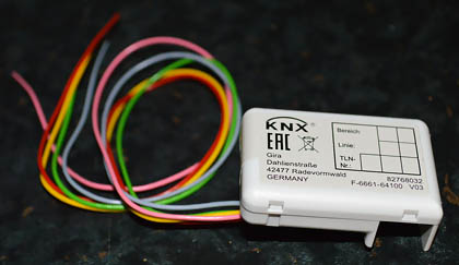 | Badezimmer Beleuchtung mit NachlauflüfterIn dem Versuch werden wir die Beleuchtung in einem Badezimmer mithilfe von KNX steuern. Mit der Steuerung der Beleuchtung soll zusätzlich ein Nachlauflüfter verknüpft werden. Beim Eintreten ins Bad wird mithilfe eines Tasters Licht eingeschaltet. Nach einiger Zeit läuft ein Nachlauflüfter an. Nach dem Verlassen des Raumes und Ausschalten des Lichtes soll der Lüfter noch eine Weile, bevor er endgültig ausgeht, nachlaufen. Funktionen und GeräteFür diese Aufgabe wird nur eine Funktion benötigt. Sie wird in ETS als „Beleuchtung Badezimmer“ mit der Adresse 0/0/2 definiert: ![]() Gruppenadresse vergeben Anschließend müssen die Geräte, die eingesetzt werden, in das Projekt eingefügt werden. In diesem Fall kommen eine Tasterschnittstelle von Gira und ein Schaltaktor von ABB zum Einsatz: ![]() Geräte einbinden Die Geräte bekommen die physikalischen Adressen 1.1.7 und 1.1.8. TasterBei der Auswahl der Taster gibt es grundsätzlich zwei Möglichkeiten. Man kann sich direkt für einen KNX-Taster entscheiden oder bei einer konventionellen Lösung bleiben. Die zweite Alternative wird sehr oft gewählt. In dem Fall muss der konventionelle Schalter (oder Taster) in ein KNX-fähiges Gerät umgewandelt werden. Dies kann man z.B. mit einer Tasterschnittstelle realisieren. Man montiert in der Wand hinter dem Schalter eine Tasterschnittstelle und schließt sie an den Schalter an. In dem Beispiel kommt die Tasterschnittstelle 1119 00 / I02 von Gira zum Einsatz: ![]() Gira Tasterschnittstelle 1119 00 / I02 Die Tasterschnittstelle stellt vier Eingänge zur Verfügung. In dem kleinen Projekt wird nur der Eingang Nr. 1 verwendet. Er wird auf "Schalten" gestellt. Eingeschaltet wird bei der steigenden Flanke (Schalter Ein), ausgeschaltet bei fallender Flanke (Schalter Aus): ![]() Parameter Tasterschnittstelle SchaltaktorAls Schaltaktor wird hier ein ABB Gerät, SA/S 4.10.2.1, verwendet. Der Aktor kann mit vier potenzialen Kontakten vier Verbraucher separat ein- beziehungsweise ausschalten. Die Belastbarkeit der Kontakte beträgt 10A. Mit dem ersten Kontakt (Kanal A) wird das Licht im Badezimmer ein- und ausgeschaltet. Der zweite Kontakt (Kanal B) schaltet den Nachlauflüfter. ![]() Schaltaktor ABB In dem Beispiel bekommt das Gerät die physikalische Adresse 1.1.7. Nachdem das zugehörige Applikationsprogramm installiert wurde, muss das Gerät parametriert werden. Für beide Kanäle A und B wählen wir die Betriebsart "Schaltaktor". Zusätzlich, für Kanal B, aktivieren wir noch die Zeitfunktion. Anschließend werden die Verzögerungszeiten eingestellt (für den Versuch jeweils 5 Sek. für Ein- und Ausschaltverzögerung). ![]() Parameter Schaltaktor Schließlich verknüpfen wir alle drei Kanäle (1 x Tasterschnittstelle, 2 x Schaltaktor) miteinander indem wir jedem die vordefinierte Gruppenadresse 0/0/2 zuordnen: ![]() Gruppenadresse zuordnen (Tasterschnittstelle) ![]() Gruppenadresse zuordnen (Schaltaktor) AbschlußDie Applikationsprogramme werden jetzt in die Geräte geladen und das Projekt ist abgeschlossen.