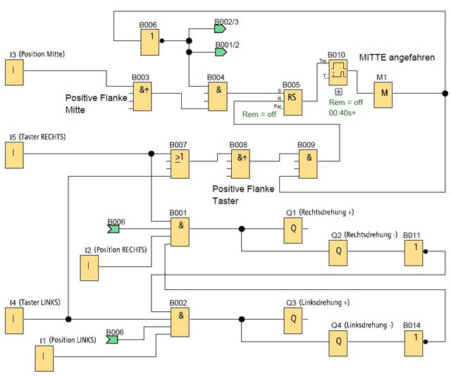 Wenn in diesem Zustand ein Taster erneut betätigt wird (Positive Flanke B008), wird über das AND-Gatter B009 der RS-Baustein B005 zurückgesetzt. Die Bewegung
