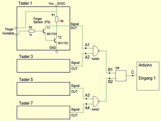 oben dargestellt. Die Signale, die die Berührungssensoren liefern, werden nicht direkt zum Arduino geführt, sondern zu den Gattern. Hier